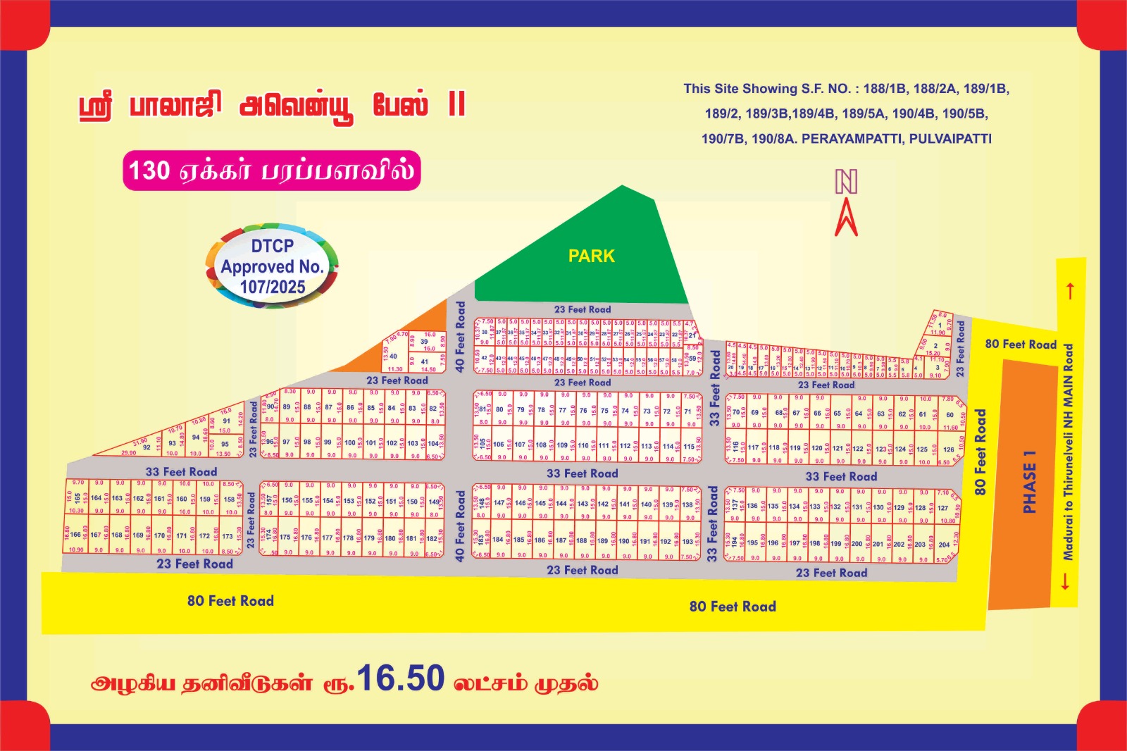 Sri Balaji Avenue – Kovilpatti is a DTCP Approved Residential Layout (Approval No. 107/2025) offering 130 premium plots in a prime and rapidly developing location near Madurai–Tirunelveli National Highway (NH Main Road). Strategically situated at Perayampatti, Pulvaipatti, this project provides excellent connectivity to Kovilpatti town and nearby major cities.